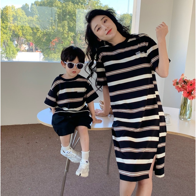 【親子服販売】親子ペアルック 親子お揃い ストライプ柄 Tシャツ ワンピース 男の子 メンズ ペアルック 半袖 記念日 キッズ カップル 家族お揃い レディース 女の子 夏服
