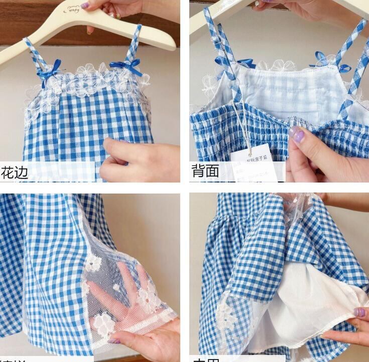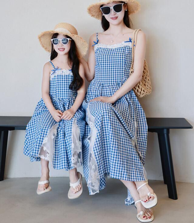 【親子服販売】青 チェック柄 キャミワンピース レース 親子ペア ペアルック リンクコーデ 親子コーデ ベビー チェック柄 シンプル 母娘お揃い 家族 おそろい | 子供とママの洋服*お揃いコーデショップ_GXsport Family