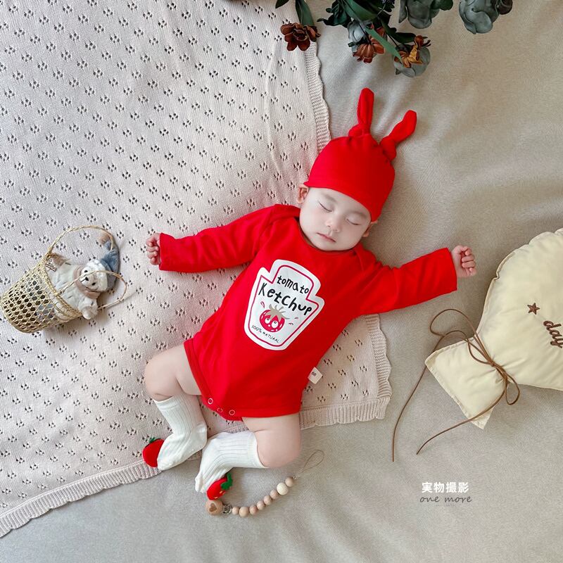 商品名:ケチャップ ハニーマスタード 長袖カバーオール 帽子付き ロンパース ベビー服 トマト 可愛い ハロウィーン 子供服 仮装 コスプレ