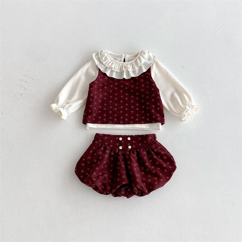 商品名:花柄 3点セット ベスト チョッキ ショートパンツ インナーシャツ 出産祝い ベビー服 女の子 セットアップ かぼちゃパンツ おしゃれ 可愛い 子供服 秋服 フリル